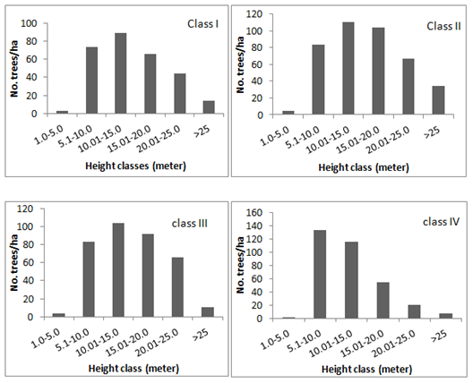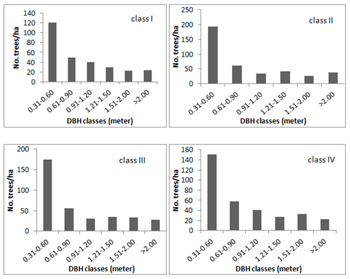 The highest numbers of trees were seen among the lowest diameter class and the number decreased with increased DBH (Figure 3). The mean distribution pattern of number of trees of different diameter classes was no different wherein, about 48 percent of the total population was found in the lowest DBH class (0.31–0.60 m) and decreased in the subsequent diameter classes continuously to as low as seven percent in the highest diameter class (Figure 3). This has resulted in classical“inverted J” pattern of distribution of diameter classes of trees which is conventionally considered to be a reflection of normal growing conditions of an uneven aged forest ecosystem.3 The subtle climatic variations seen in the vertical and horizontal profiles of the ecosystem provide variable climatic conditions congenial for diverse species, enabling many species to co–exist.47,48,50