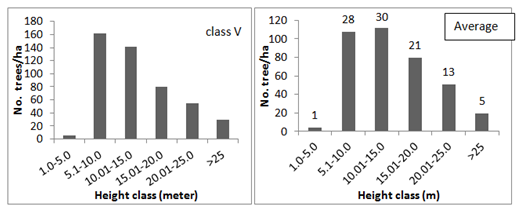 Figure 2 Height class distribution of trees in different size class of the sacred groves (values indicated above the bars in the graph of average tree height is the percentage of tree population).