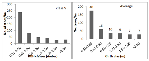 Figure 3 Girth class (DBH) distribution of trees among the size class of the sacred groves (the values indicated above the bars in the graph depicting the average DBH is the percentage).