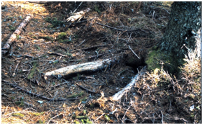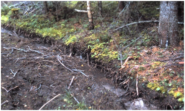 Figure 1 Deep rutting in the wet humified soil and lots of roots are cut off after a thinning operation.