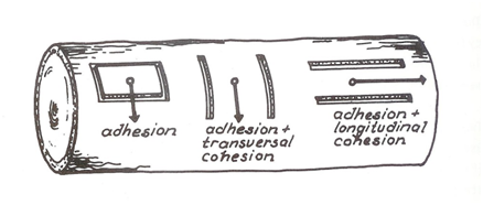 The strength of root bark (for Picea abies, Norway spruce, and Pinus sylvestris, Scots pine) have been studied by Wästerlund.10 Figure 4 shows the principal design of the test-rig to measure the strength of bark on the roots. By cutting in different ways the properties of bark could be measured (Figure 5) like tangential or longitudinal way or with total surrounded cutting the adhesion to wood samples could be measured and by doing that during different months the seasonal variation could be estimated.