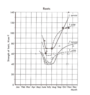 Figure 6 The seasonal variation of the strength of bark for roots (N per cm-2). Spruce roots (∆) tangential and (▲) longitudinal. Pine roots, ( ) Tangential and (■ ) Longitudinal direction.10