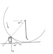 The sap period for these trees start in the top bud and continues down the stem and finally down to the root system, which in nortern Sweden is in July (based on several measurements on stem bark,10,11 it is good that forestry in the Northern countries usually have their summer vacancy this period. Suppose a driven tire is passing a root. The root could be a spruce heart root lying almost uncovered on top of the soil. The wheel is entering the root and is resting only on the root with the wheel. The entry angle is 45° The contact area between the wheel and the root is 40 cm2, (Figure 6). Suppose only the load of the tyre is influencing the root. The resultant of the force exposure affecting the root is equal to the load Q of the tire. The shear force F acting on the root bark is then F= Q cos 45°.