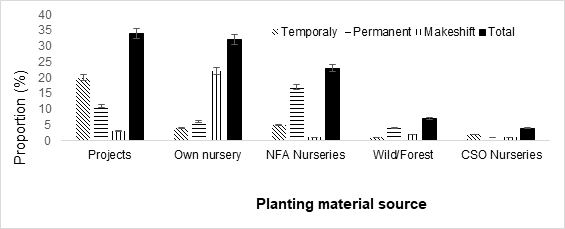 Exotic tree species were multiplied in higher numbers compared to their indigenous counterparts, and Forestry/tree restoration projects (ꭓ2=37.6875, DF=4, P=0.0001) were the most important source of seed for temporary nurseries (Table 3). The other small-scale nurseries relied on wild sources (ꭓ2= 57.03, DF=4, P=0.0001) including forests and woodlands as well as naturally scattered trees in villages. On the other hand, government nurseries such as the National Forestry Authority (NFA) were an important source of seed for permanent nurseries (ꭓ2=20.36, DF=4, P<0.001) although, some participants within these government institution relied on natural regeneration (wildings) as also a source of planting materials.