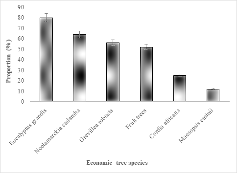 The choice of species in large-scale nurseries was driven by economic benefit while the same in small-scale nurseries was driven by need for firewood, fruits, shade and supply of stems to support the under crops. Consequently, the commercial oriented nurseries raised mostly exotic trees ranging between 25,000 and 300,000 seedlings, valued between USD $2000 and USD$7, 000 a year. The most important economic species raised included E. grandis (80%), N. cadamba (60%), G. robusta (56%), C. africana (25%) and 10% M. eminii (Figure 5). This suggests that E. grandis was highly demanded or promoted in this region as a safeguard against firewood and timber shortage. Indigenous species were rare in large nurseries and about half of these nurseries raised at least one fruit species, indicating that fruit growing too, is important to local livelihoods in this region.