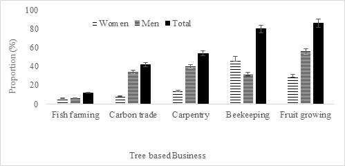 The participants selected fruit growing, beekeeping, eco-tourism, carpentry and carbon farming among the lucrative tree based enterprises in the region. Gender bared a positive effect on the choice of enterprise (ꭓ2=27.432, DF=4, P<0.001). For example, the men were more associated with timber and carbon farming while the women and youths were more associated with fruit growing (selecting high yielding and fast growing varieties) and beekeeping (Fig. 6). Both men and women were however, involved in tree nursery business, producing a wide array of exotic and indigenous tree seedlings and a few indigenous species including Khaya anthotheca (Welw.) C.DC. Albizia coriria Welw. ex Oliver, and Milicia excelsa (Welw.) C. Berg (Figure 6).
