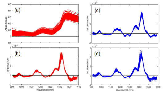 Wavelengths from 900-1600nm were selected for the next pre-processing spectra treatment data analysis. Many pre-processing treatments on the spectra such as SNV (standard normal variate), MSC (multiplicative scatter correction), 1st derivative with 25 smoothing-point (SP) (Savitzky-Golay algorithm), 2nd derivative with 25 SP (Savitzky-Golay algorithm), and their combinations were applied. Mean-centering was applied to all spectra while CV-PLSR analysis was being performed. The best pre-processing spectra treatment was determined by the lowest value of the root mean square error for cross-validation (RMSECV) followed by its coefficient of determination for cross-validation (R2CV) and the optimum number of latent variables (LV) obtained from CV-PLSR analysis. MATLAB R2016b (The MathWorks, Inc., Natick, Massachusetts, United States) was used for multivariate data analysis.
