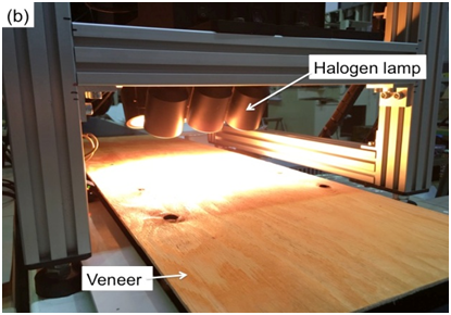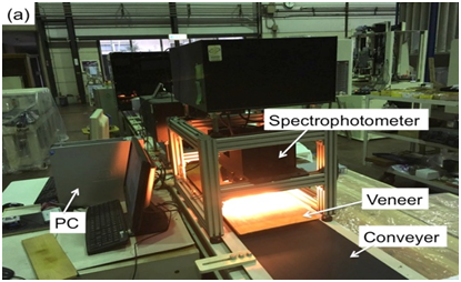 Near-infrared (NIR) spectroscopy, which has been being widely used in the field of wood science in the last 20 years, seems helpful for increasing the efficiency in the quality control (QC) of the product. NIR spectroscopy, as advanced non-destructive testing technology, shows promising application, as transmitted or reflected spectra of electromagnetic waves ranging from 800 to 2500 nm have been used for the online or on-site measurement of various organic materials, such as agricultural products, foods, polymers, textiles, pharmaceuticals, and petrochemicals.2 Newly developed technology using NIR spectroscopy should be useful to quickly assess the quality of the wooden veneer, i.e., the stiffness (modulus of elasticity/MOE) and the moisture content (MC), without destroying the materials.