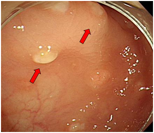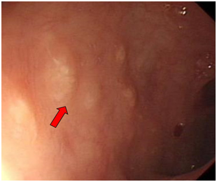 A 58-year woman with a 1 month history of diarrhea and abdominal pain was referred from local clinic for evaluation of diarrhea. She had dyslipidemia and taking anti hyperlipidemic agents. She had no history of diabetes mellitus, intravenous drug use, or other immunosuppressed conditions. She had no recent abroad travel history and surgical history. Her physical examination was unremarkable. The patient was alert and did not appear to be in poor physical health. Her abdomen was soft and mild hyperactive bowel sound. Her height was 160cm, and her weight was 61kg, with no recent episode of malnutrition or weight changes. On arrival our hospital, she had a still mucoid stool and abdominal discomfort with taking two weeks of antibiotics. All routine laboratory tests were within the reference ranges. Sigmoidoscopy performed in primary care clinic 2 weeks ago showed mucosal edema, whitish patchy and less than 5mm sized multiple inflammatory papules at sigmoid colon. Sigmoidoscopic finding looked like pseudomembranous colitis (Figure 1). Sigmoidoscopic tissue biopsy revealed chronic nonspecific colitis. The biopsy cultured performed at the local clinic revealed Group D Enterococcus avium. These species are susceptible to Ampicillin, gentamycin, penicillin G, Vancomycin. After 2 weeks treatment of probiotics, and ciprofloxacin, we planned to perform follow up sigmoidoscopy. Mucosal edema and multiple white inflammatory papules were improved on sigmoidoscopy (Figure 2). Follow up biopsy and stool culture was done. Biopsy revealed chronic inflammation with lymphoid follicles and stool culture result was detected normal intestinal flora. After two weeks treatment of ciprofloxacin, she returned to an outpatient clinic for follow-up. Her mucoid stool was subsides and general condition was improved. At present, patient is on regular follow up based at outpatient clinic.