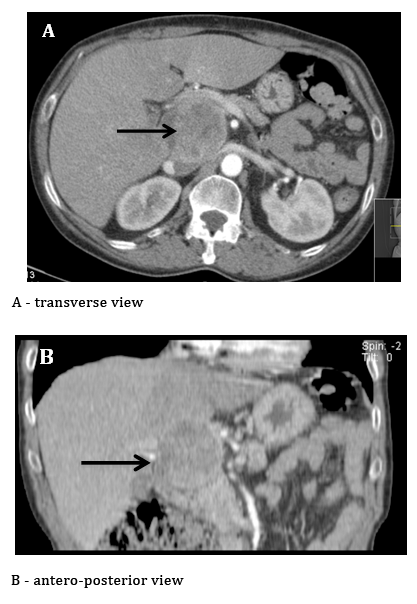A 60year-old female with a history of Diabetes mellitus type 2, under treatment with sitagliptin and metformin and severe arterial hypertension treated with 4drugs (nebivolol, lecarnidipine, olmesartan and hydrochlorothiazide), was admitted to the Internal Medicine Department due to gastroenteritis and dehydration-associated acute renal failure (ARF). She reported weight loss (more than 15%), anorexia, asthenia, polydipsia, polyuria and frequent episodes of muscle cramps, with 1year of evolution. She presented no risk factors for chronic liver disease. She was the mother of 4, one of them with Cushing's syndrome. An abdominal ultrasound and angio-CT was performed for the investigation of renal failure. These exams revealed a non-cirrhotic liver, with a heterogeneous hepatic nodule of 63x54mm in the caudate lobe. This nodule had a heterogeneous contrast enhancement and included some areas of low density and enhancement (suggesting necrosis) (Figure 1). Liver function tests and tumor markers (CEA, CA19.9 and αFP) were assessed and unremarkable. Abnormal liver function could be present in the context of cirrhosis or obstructive jaundice and a raise in tumor markers could be interpreted in the context of primary or secondary neoplastic disease of the liver. Upper and lower GI endoscopies were performed to exclude digestive primaries, which showed no endoscopic lesions. Surgical resection was proposed due to location-related difficulties in obtaining a pre-operative biopsy.