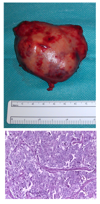 Figure 2 Macroscopic aspect (A) and histological features (HeE, 200x) (B), consistent with the diagnosis of paraganglioma.