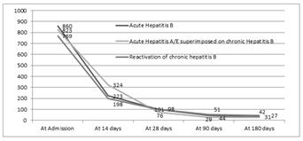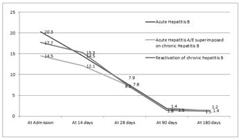The difference between the acute and chronic hepatitis B was significant in the levels of hemoglobin, though when comparison was made between acute, superimposed hepatitis A/E and chronic group, it was found significantly different between acute hepatitis B and Superimposed Hepatitis A/E group. Similarly, in the serum albumin levels, there was no statistical significant difference between acute and chronic group but in the chronic group itself, it was lower in patients with reactivation of chronic hepatitis B as compared to superimposed group. There is no difference in bilirubin levels at the end of 28days between each group and prolonged jaundice may not be able to pick up chronic hepatitis B. Figure 2A, 2B and 2C denotes the progression of bilirubin, ALT and AST among patients with acute hepatitis B, Superimposed hepatitis A/E on CHB, and chronic hepatitis B reactivation.