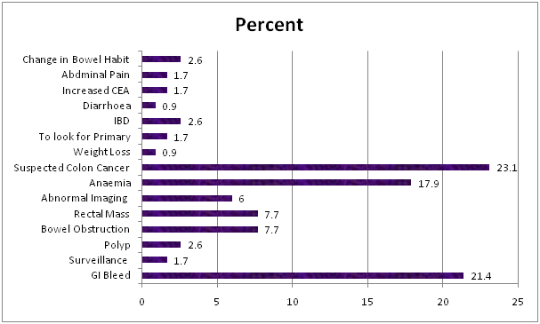 Results: The mean age of patients was 65. 53% of patients were female. Only 5% of patients were below the age of 40. Left-sided tumors were more common than right-sided ones. The main reasons for referring the patient for a lower GI endoscopy was suspected cancer, GI bleed and anemia.
