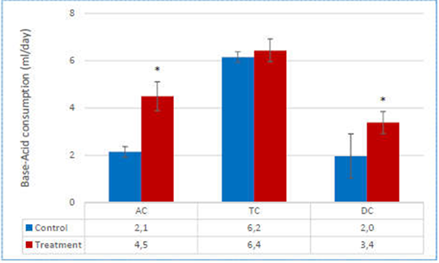 Figure 1 Average base-acid consumption over the entire control (n=6) and treatment period (n=6). Results are provided for the ascending colon (AC), transverse colon (TC) and descending colon (DC).