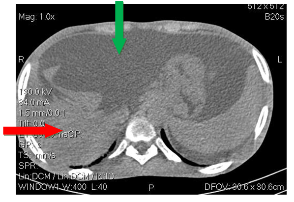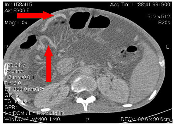 Acute mesenteric ischemia (AMI), sometimes referred to as enteric ischemia, is a diagnostic and therapeutic emergency.1 It affects the small intestine and is opposed by its topography to colonic infarction or necrotizing colitis.2 In a series of 170 patients, AMI is associated with occlusion in 34% of cases, occurs in the absence of occlusion in 60% of cases and is not documented in 6% of cases. Only rapid and multidisciplinary management can hope to improve the severity of this pathology. Mortality of AMI remains high (30 to 95%) but depends on etiology.3 It is caused by the acute or chronic interruption of splanchno-mesenteric blood flow through mechanisms such as embolism, thrombosis or intestinal hypoperfusion. Embolic ischemia occurs from emboligenic heart disease or atheroma of the aortic arch. Ventricular aneurysms, rhythm disorders, pathology or prosthesis of mitro-aortic valves may promote thrombi formation and their peripheral embolism. Thrombotic ischemia develops in pathological digestive arteries (stenosis, atheroma, arteritis). Sometimes thrombosis occurs on a vasculitis whose main ones are the nodous periarteritis, the rheumatoid purpura, the Wegener’s disease, the Churg Strauss disease, the microscopic polyangeitis, the hypereosinophilic syndrome and the Takayasu disease. Anti-phospholipid syndrome, thrombophilia or hypercoagulability may also be involved. Intestinal hypoperfusion is of multifactorial origin. It may be related to pharmacological interactions of patients suffering from multipathologies requiring many drugs which are cofactors of mesenteric vasoconstriction. The other causes of mesenteric vasoconstriction are any type of shock, dehydration, dialysis, and major cardiac or abdominal surgery, large doses of vasoconstrictor without taking into account splanchno-mesenteric hemodynamic.4 The absence of clinical signs requires the use of additional paraclinical examinations. CT scanning is currently the most effective first-line test.5 Management requires multidisciplinary collaboration and supervision in intensive care settings. The therapeutic strategy must simultaneously combine a symptomatic resuscitative component aimed at optimizing splanchnic oxygenation and a curative surgical and/or radiological component depending on the etiology of ischemia. We report a case of acute mesenteric ischemia in a young subject in a National and University Hospital of Benin; this ischemia was followed by an oedemato-ascitic decompensation revealing cirrhosis.