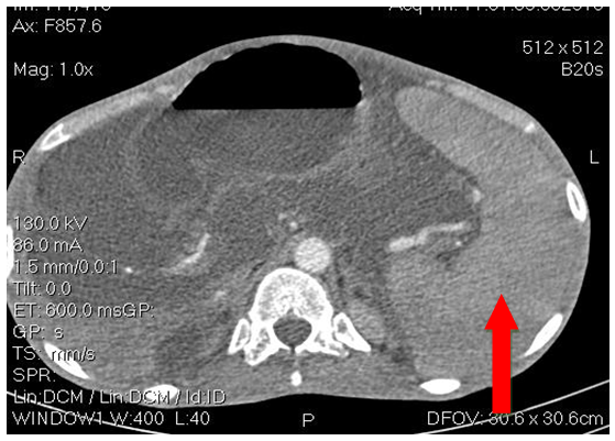 The abdominal-pelvic CT, performed without and with injection of contrast medium at arterial and portal times, is the only necessary and sufficient examination, urgently recommended for the positive diagnosis of acute mesenteric ischemia (AMI).6,11,12 It must be carried out without delay, even in the presence of renal failure, as the risk of ignoring an AMI far exceeds that of the injection of the contrast agent.6,11,13 It allows to characterize as well as possible the nature and morphology of vascular occlusion.14 In addition, it provides an assessment of vascular lesions and signs of intestinal necrosis that will guide revascularization treatment15 and digestive surgery8 respectively. Signs of digestive suffering include parietal thickening, parietal pneumatosis sometimes associated with an air bubble in the portal vein, infiltration of mesenteric fat, ascites. Signs of intestinal necrosis include thinning and/or failure to raise the intestinal wall and dilation of the intestinal handles >25mm.8 The abdominal-pelvic CT could not be performed on our patient before the surgery, given the urgency of the emergency and the diagnosis was made intra operatively.