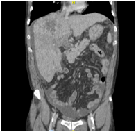 Tumor markers results were: alpha-fetoprotein, 1,596ng/dL normal, 0-9 ng/dL; CA15-3: 27.3U/mL normal, <30; CA 125: 609.4 normal, 0-35kU/L; CA 19-9: 75.7 normal, < 37U/mL. Serologies for hepatitis B and C were negatives.