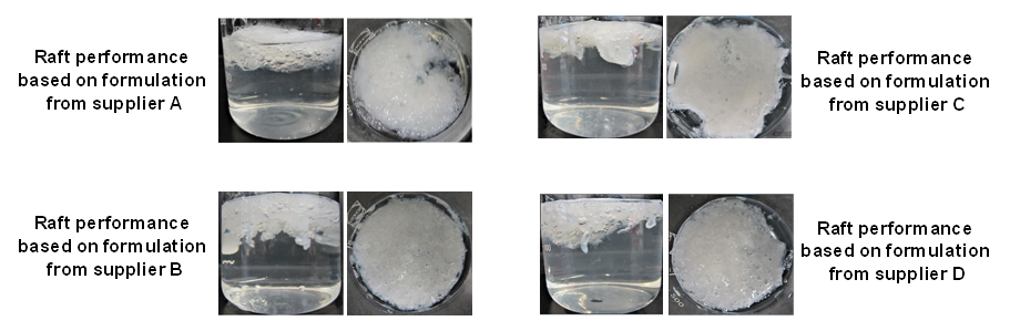 The raft strength according to the data showed similar performance attributes for the anti-reflux formulation from supplier A + B and D, only the product from supplier C showed significant lower values compared to the three others. The disadvantage of the raft strength method is getting visible by the observation of the given standard deviation, which is calculated from seven measurement for each formulation. The reason for the high standard deviation of this method could be seen based on the images obtained from the formed raft in the beaker prior to the measurement. As shown in Figure 5 the raft is not homogenously formed on the upper surface of the 0.1 M HCl solution in the beaker. During the investigations the L-hook is lifted upwards through the swollen gel layer and depending on the point, where the probe is getting in contact with the raft mass, different values are obtained. Based on the structure of the formed swollen layer and the flexibility of the L-hook attached to the Texture Analyser, different values are obtained when the probe is lifted through the swollen gel mass. This explains the high standard deviations of the given method in the British Pharmacopia.