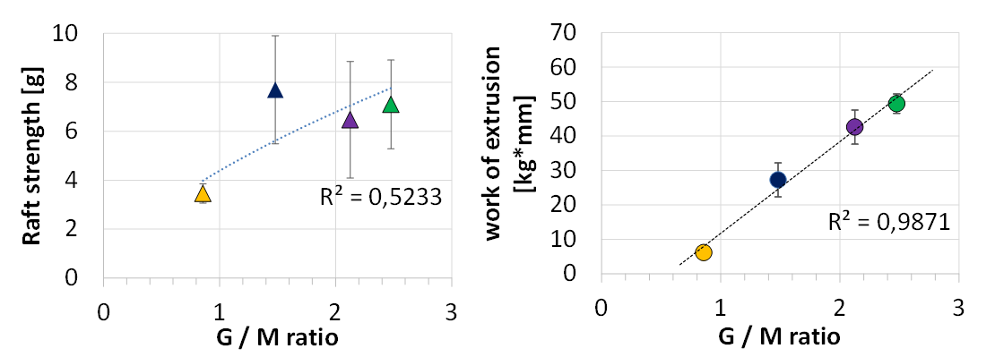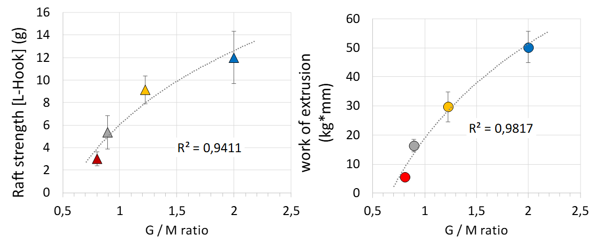 In a next step the alginate were isolated from the raft and analysed via nuclear magnetic resonance (NMR) technique. The relationship between the chemical structural elements of the 1,4-α-L-guluronic (G) to 1,4-β-D-mannuronic (M) content of the alginate according to the G / M ratio as a function of the raft strength as well as the work of extrusion is shown in Figure 6. Whereas the raft strength showed no sufficient correlation to the chemical structure elements of the alginate, the work of extrusion fulfilled such a relationship with a regression coefficient of nearly 99 %. Based on this data a clear trend of increasing raft gel layer resistance with increasing G / M ratio of the alginate was observed.