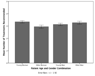Results: 472 medical trainees from 75 institutions participated in the study. Trainees were significantly less likely to recommend the necessary treatments (comprehensive history, dietary intake information, digital rectal exam, psychological stress assessment, and routine physical exam) for older female patients than for young female patients. The digital rectal exam was recommended for a greater proportion of older male patients than young female, young male or older female patients. Additionally, male trainees were less likely to recommend necessary treatments overall as compared to female trainees. Female trainees tended to have more optimistic affective evaluations of patients, illustrating more general positivity toward patients, expecting better medical compliance from patients, and perceiving patients to be more health conscious.