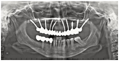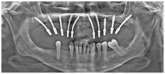 Figure 2 Orthopantomograph (OPG) of the patient revealing placement of 10 smooth-surfaced implants with oblique placement in anterior region based on the principle of cortical engagement.