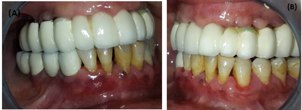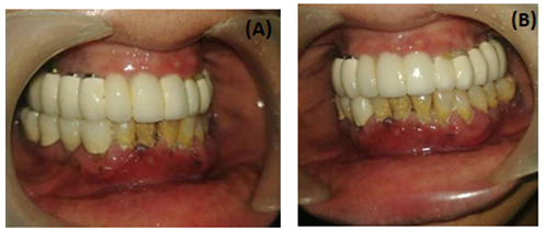 The present case report put forths a case of aggressive periodontitis (Figure 1) in a 36-year old female patient with established Crohn’s disease diagnosed since 8 years who reported with pain and mobility in maxillary molar region wherein multiple surgical attempts had been made in order to control the gingival inflammation and who was, later, successfully managed with implant therapy. The patient was on medications including steroid therapy for few years which were gradually tapered with the resolution of her gastro-intestinal symptoms around 3years back. The patient was, from then, on diet modifications advised to the patient with frequent follow-ups for routine check-ups though without any known complications. She gave a history of bleeding gums with mobility of teeth and recurrent ulcerations since last 5years. On clinical examination, there was bleeding from the gingiva in the affected region with deep pockets and marked enlargement and superadded inflammatory changes in the said area as well as other areas of the oral cavity. Furthermore, there was generalized mobility in all the teeth except in the mandibular premolar and molar region in third quadrant. There was a history of some kind of dental treatment received in the past for similar reasons though the problem did not subside and the patient continued to have similar problems of generalized bleeding, mobility of the teeth and frequent ulcerations throughout the oral cavity. Orthopantomograph (OPG) of the patient revealed a severe generalized bone loss indicative of an aggressive periodontitis with few missing teeth in both the arches. Extraction of all the poor prognosis teeth with grade III mobility followed by implant placement was the line of treatment decided. The probability of peri-implant disease and its evidence was discussed with the patient. The possibility of success with smooth-surfaced implants in the said cases was, also, explained to the patient. After taking patient's consent, it was decided to restore the missing teeth with the help of smooth-surfaced implants with cortical engagement. In order to prevent the complications of uncontrolled tissue shrinkage in the present case, extraction of the anterior teeth was followed by a temporary bridge with the premolars as abutments. It was, also, planned to prevent the placement of implants in maxillary incisor region to provide more prosthetic freedom during the final phase. After a gap of two weeks, surgery was planned. In order to provide an equal occlusal table bilaterally, a cantilever bridge in the lower was planned.