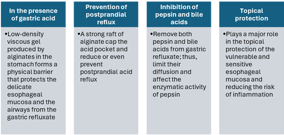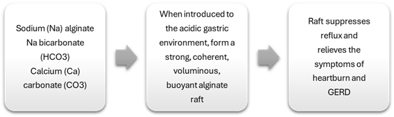 Heartburn is the most common symptom presented by patients in clinical practice. Causes of heartburn ranging from cardiac origin (heart attack) to acid reflux. Different acid suppressing agents like antacids, H2 blockers, PPIs (Proton pump inhibitors) are commonly used. Alginate-based raft-forming products have been used for many years in the management of heartburn and acid reflux disorders and are widely available worldwide. They are commonly used to alleviate symptoms of acid reflux disorders, working through a mechanism distinct from conventional antacids. In the presence of stomach acid, alginates form a gel. These formulations typically include sodium or potassium bicarbonate, which, when exposed to gastric acid, produces carbon dioxide. This gas is trapped within the gel, transforming it into a foam that floats on the stomach contents, much like a raft on water. The strength of the alginate raft depends on various factors, including the amount of carbon dioxide produced and trapped, the molecular structure of the alginate, and the presence of aluminium or calcium in the antacid components. Raft formation happens quickly, usually within seconds of ingestion and offer longer-lasting relief compared to traditional antacids. Optimal benefit of alginate is achieved when taken following a meal. Alginate-based raft-forming products are also used to manage reflux symptoms in infants, children, pregnant and breast-feeding women. Their unique, non-systemic mode of action provides both fast and long-lasting relief from heartburn, ensuring their continued role in treating such conditions.