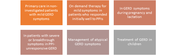 Various types of medications are commonly used in management of acid reflux disorders including antacids of different formulations (tablets & liquids), numerous liquid and tablet antacid formulations, antacid/alginates, histamine H2-receptor blockers, proton pump inhibitors (PPIs) etc (Table 1). Antacids offer rapid relief from symptoms and have a quick onset of action, but their duration of effectiveness is relatively short.