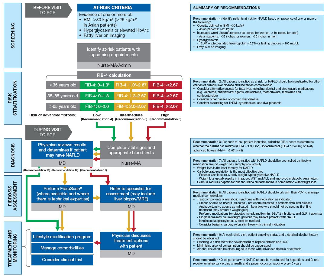 Results: We developed a simple algorithm to identify risk factors for NAFLD and recognize patients with progressive hepatic fibrosis. Patients with obesity, type 2 diabetes, abnormal liver tests, or incidental findings of hepatic steatosis should be evaluated for NAFLD, hepatic fibrosis and cardiovascular risk using family history and accepted calculators (FIB-4 and ACC/AHA). Risk stratification includes cardiovascular and hepatic complications. Patients with ≥ stage 2 fibrosis by non-invasive testing should be referred to hepatologists. We recommend lifestyle interventions and medical management of comorbidities for patients with NAFLD. Patients should be followed long-term with assessment of liver status every 6 months.