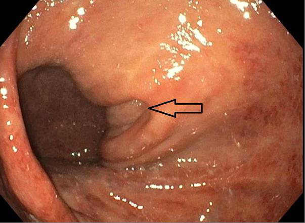 A 74-year- old nursing home resident male with CAD status post cardiac pacemaker, diabetic nephropathy current on hemodialysis and CVA without residual side-effects presented with fever of 102 F and altered mental status. Later he was admitted to the intensive care unit for acute respiratory failure, with bacteremia and septic shock most likely from right thigh abscess. On arrival, he was hypotensive and un-responsive to intravenous fluids. After rapid intubation and central line placement, he was started on aggressive hydration, intravenous vancomycin, pipercillin with tazobactam and pressors. White count 36.6 with left shift, metabolic acidosis on arterial gas with pH of 7.13 and lactic acid trending at 2.5 to 4.5 were noted. Later, a CT scan of right hip showed acute osteomyelitis involving the posterior aspect of the proximal to mid right femur with overlying abscess cavity. A CT scan (abdomen and pelvis) showed presence of gastric wall pneumatosis, transverse duodenal diverticulosis, 2.6cm small bowel lipoma and air/gas lucencies noted within the distal main and left portal veins (Figures 3 & 4). EGD showed mild gastritis in antrum of stomach and single smooth nodule measuring 5-6mm in size in the antrum (Figure 5). Owing to multiple co-morbidities, septic shock and unstable condition, conservative optimal management was made after the extensive family meeting. Later, the family opted for palliative care.