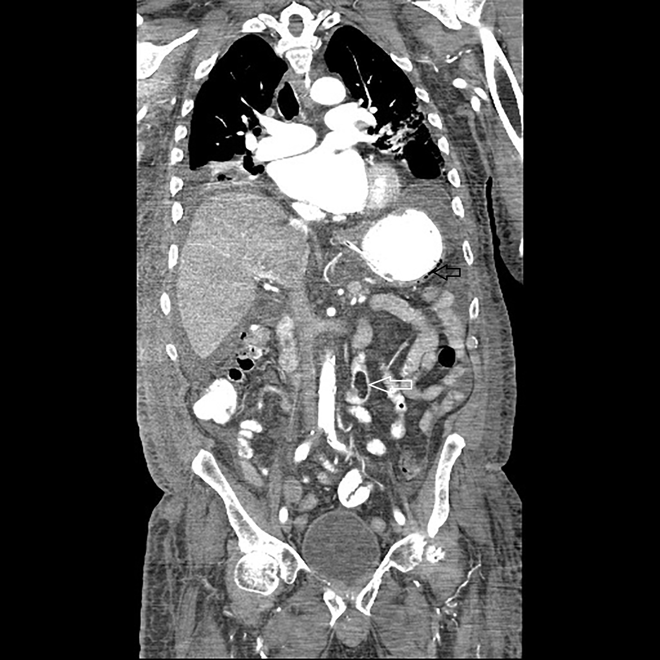 Figure 1 CT scan of the abdomen (a) small dark arrow showing interval appearance of gastric mural pneumatosis, (b) big white arrow showing ventral sliding hernia, (c) small white arrow showing status post subtotal colectomy and right anterior colostomy, and (d) fluid-containing distal thoracic esophagus, dilated stomach containing fluid and particulate matter.