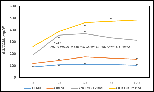 The result of this study indicate that the aberrant glycemic responses to an standard OGT in obese and obese-T2DM rats were consistent with accelerated gastric emptying in young obese+T2DM rats, in addition to glycemic responses consistent with onset of gastroparesis in combination with insulin resistance in older obese+T2DM rats. In contrast, in younger non-diabetic rats that share the same epigenetic trait for obesity (the -cp trait) exhibit moderate insulin resistance and glycemic responses that are consistent with only modestly accelerated gastric emptying, and without evidence of gastroparesis. The dysregulation of gastric emptying is consistent with impaired amylin actions on gastric emptying, while in older obese-T2DM rats the glycemic responses were consistent with the onset of gastroparesis in combination with significant insulin resistance. In addition, the origins of the genetic background hosting the epigenetic -cp trait enable greater clarity in the contributions of obesity per se and its differential role in progressing to insulin resistance and T2DM. Regardless of the pathophysiologic mechanisms involved, the glycemic characteristics of Obesity vs Obesity+T2DM were characterized in the corpulent rat, an animal model metabolically similar to the same disorders as they occur in man and animals.