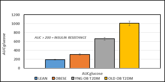 Figure 4B Effect of strain and phenotype on AUC glucose of rats. Data are mean ± 1 SEM, n = 5-8 rats/group. P = < 0.05 for lean vs obese, and lean vs Obese+T2DM. The data are consistent with insulin resistance obese rats, and the magnitude of insulin resistance was greater in the obese+T2DM than in the obese non-diabetic rats.