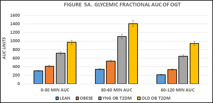 Figure 5A Effect of strain and phenotype on AUC glucose OGT phase fractions of rats. Data are mean ± 1 SEM, n = 5-8 rats/group. P = < 0.05 for lean vs obese, and lean vs Obese+T2DM. The data are consistent with accelerated gastric emptying in obese and obese+T2DM rats, and with delayed peripheral glucose uptake in old obese+T2DM rats, suggestive of the neurologic onset of gastroparesis.