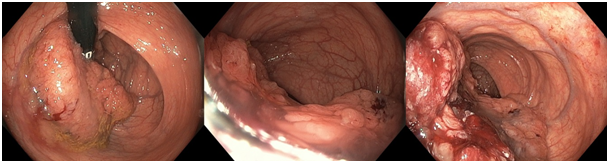 Figure 1Colonoscopy with retrovision and antevision in the rectum showing a large villous adenoma, spreading semi-circumferentially along the rectal wall.