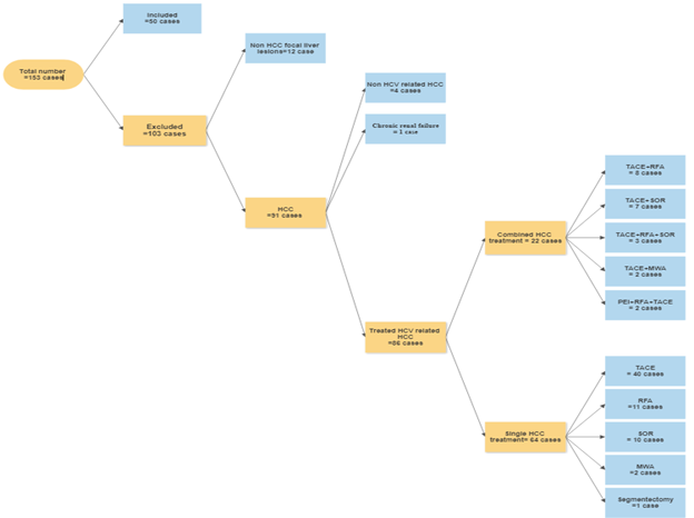This was a cross sectional study which included 50 naive HCV related HCC adult patients who were admitted to inpatient wards of Gastroenterology and Hepatology Unit of Specialized Medical Hospital (SMH) in Mansoura University in Egypt. Exclusion criteria were the presence of arterial or venous thromboembolism in the preceding 3 months; anticoagulant therapy within preceding 6 months; known congenital coagulation abnormality; previous treatment for HCC either surgical or non-surgical (86 cases); HCC related to other causes of liver diseases (4 cases); focal hepatic lesions other than HCC (12 cases) and presence of chronic renal impairment (one case) (Figure 1). The study duration extended from August 2017 to July 2018. All enrolled patients were subjected to detailed medical history, clinical evaluation, assessment of performance status (PST) by scale of the Eastern Cooperative Oncology Group (ECOG) (Table 1).