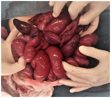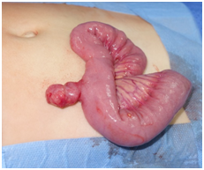 Figure 5 Operative photograph of Meckel Diverticulum exteriorized trough the umbilicus incision and the two ports positions in a transumbilical video-assisted Meckel Diverticulum resection.