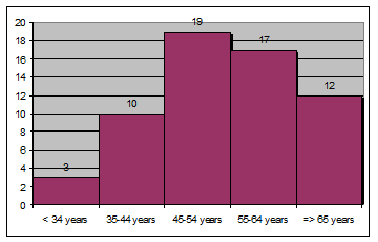 The patients’ sex distribution were shown in Figure 1. In the study 46 patients was male (75%) and 15 patients was female (25%) with a male female ratio of 3:1. Among the patients histogram (Figure 2) showed that most of the patients age was more than 45 years.(19 patients’ age was 45-54 years, 17 patients was 55-64 years and 12 patients was >65 years) at the time of presentation.