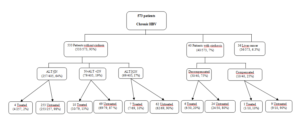 In this study, 2.88% of patients received hepatitis B antiviral treatment or based either on lamivudine, tenofovir or pegylated interferon. This proportion is very low like in the United States [11]. In our context, this may be explained by the fact that people did not have access to treatment at the time. Tenofovir, lamivudine, and pegylated interferon were introduced since 2014 as part of a government treatment program. This has made it possible to put many more patients under treatment.