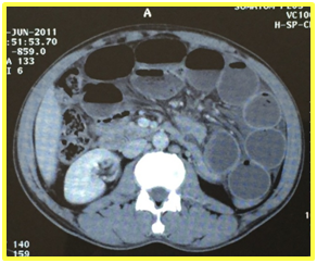 Figure1: A CT scan with contrast revealed a segmental thickening of the last ileal loops and distended small bowel loops without a detectable transition point.