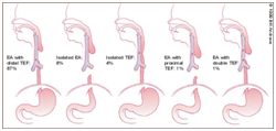 i)Vertebral Anomalies, ii) Anal Malformations, iii) Cardiac Malformations, iv) Tracheo-oesophageal Fistula, V) Renal deformities, vi) Limb radial defects alternatively, additional disorders which may be affiliated with oesophageal atresia may be defined by the CHARGE syndrome: Coloboma, Heart disorders, Retarded development or growth, Central nervous system anomalies, Genital hypoplasia or hypogonadism, Ear abnormalities or deafness. Apart from the aforementioned conditions, symptomatic triads such as Down’s syndrome, Potter’s syndrome, Fryn’s syndrome and Fanconi’s syndrome may be exemplified.7 Infants born with oesophageal atresia may depict cardiac malformations (30%) which may predominantly be duct dependent lesions (Tetralogy of Fallot, pulmonary atresia, tricuspid atresia, transposition of great arteries, patent ductus arteriosus, ventricular septal defect or anomalies of the aortic arch).1,2 Instances of tracheo-oesophageal fistula accompanied by the non duct dependent cardiac defects may mandate a preferred reconstruction of the oesophagus. However , oesophageal atresia associated with duct dependent cardiac lesions may be temporarily managed with the administration of Prostaglandin E, preceding the surgical closure, in order to address the cardiac anomalies foremost. Anomalies such as hypospadias, undescended testis, renal agenesis, hydronephrosis, vesicouretral reflux and ambiguous genitalia may outline the spectrum of coexistent genito-urinary malformations. Gastrointestinal malfeasance usually constitutes of an imperforate anus, duodenal atresia, malrotation of the gut, annular pancreas and pyloric stenosis. Anomalisms of the respiratory system may elucidate an oesophageal atresia, ectopic superior left bronchus, a trifurcated trachea or tracheal bronchi, congenital bronchial stenosis or the emergence of tracheal, bronchial and pulmonary agenesis.6 Respiratory abnormalities with predominant tracheomalacia and pulmonary atelectasis may necessitate an early bronchoscopic evaluation. Chromosomal defects such as a Trisomy 18 and 21 may infrequently concur. The surgical closure of oesophageal atresia when appearing concomitantly with Trisomy 18 may require approval from an ethics committee.