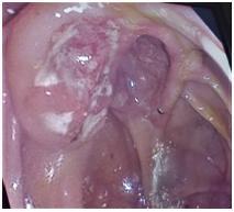 The patient received chemotherapy for his tumor and has been followed up. The disease was in clinical (CDAI Index <150) and biological remission (CRP = 2mg/l and fecal calprotectin = 9ng/kg). We introduced mesalazine as treatment for Crohn’s disease. However, 2months after the end of chemotherapy, the check-up tomography showed a thickening of the sigmoid colon. We completed with a chromo colonoscopy showing budding ulcerative lesion of the anastomotic area (Figures 3,4) without sigmoid lesions. The mucosa of the last 15cm of the ileum was nodular without ulcerations. The pathological examination of the anastomotic lesion showed the recurrence of adenocarcinoma. The patient underwent totalization of the right colectomy and resection of the last 15cm of the ileum. Anatomopathological examination of the resected specimen found adenocarcinoma recurrence in the ileocolic anastomosis without lymph node metastases with healthy surgical limits. The evolution was favorable in the short term (current follow-up of 1 month).