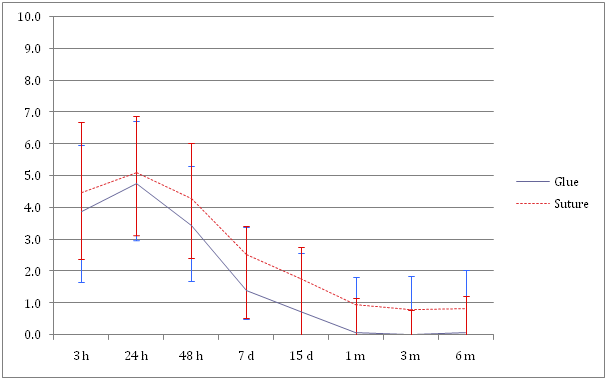 Unfortunately, operative time was not an endpoint of the study, so it was not recorded and no data are provided to support the assumption of a shorter surgical time in glued mesh hernia repair. However, the first impression and mostly the results of this pilot study convinced us of the superiority of glue vs suture in the fixation of mesh and we changed our practice as a result of this. Nowadays, we almost always use to fix our meshes with cyanoacrylate glue, both in open and laparoscopic hernia repair. Primary endpoint of our trial was early and late postoperative pain. According to Alfieri et al.22 chronic pain has been defined as the pain lasting 6 or more months after the operation.