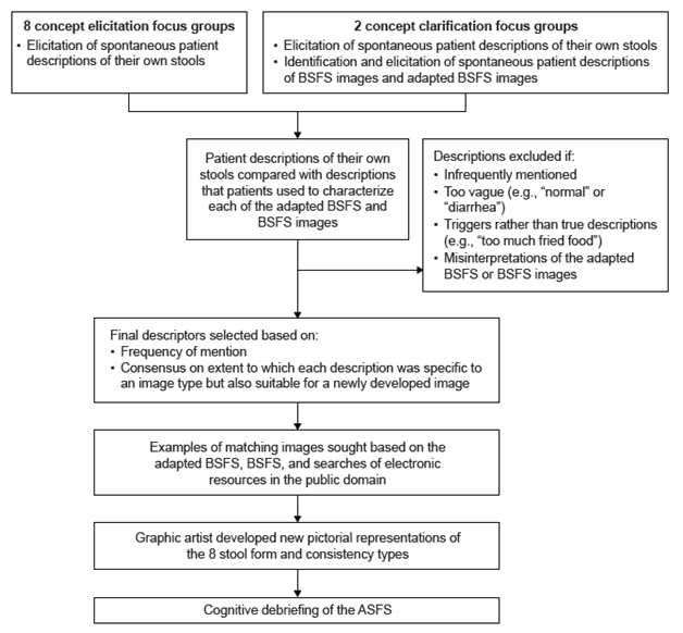 Conclusion: The ASFS, developed using spontaneous patient reports and rigorous qualitative methods, was well understood by patients with IBS-D and was relevant to their experience of stool form and consistency with IBS-D. Further evaluation is ongoing to confirm its utility in clinical research and in the clinical setting as a tool to monitor change in patients with IBS-D and to assess treatments.