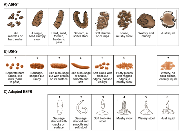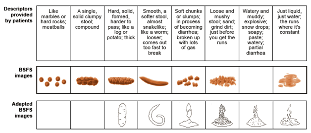 If the scale does not include the corresponding image, an empty box is shown. BSFS: Bristol Stool Form Scale. BSFS images reproduced from Heaton KW. Understanding your bowels: Family Doctor Publications; 1999, with permission from Family Doctor Publications. Adapted BSFS images reproduced with kind permission from Springer Science+Business Media,11Figure 1, ã1995 Plenum Publishing Corporation.