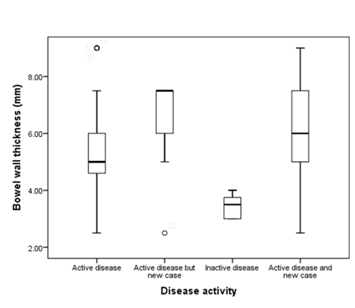 In the current study, the ultrasonography disease activity determined based on variables such as mural thickness, absence of haustration, presence of mesenteric lymphadenopathy, peristaltic motion, fat stranding and loss of compressibility. Some of the studies have shown a significant difference between colon wall thickness among cases with moderate to severe colitis and cases of mild or inactive colitis either before or after treatment.24,25 In our study the mural thickness of colon among new cases of UC (6.4±1.3mm) was significantly more than this value in cases who diagnosed as UC flare(5.5±1.7mm, P=0.02). Moreover average thickness of colon wall in active or new cases of UC (average 5.9, range 2-9mm) was significantly more than mural thickness in control group (average 3.3, range 3-4mm).