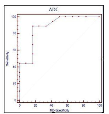 The search for an ADC value to be used as cut-off for the presence of post-operative recurrence of degree i3 or i4 was conducted through the analysis of ROC curves, highlighting that a value of ADC ≤ 1.82 x 10-3 mm²/s could predict recurrence of degree >i2 with a sensitivity of 88.9% (51.8 to 99.7, CI 95%) and a speci-ficity of 83.3% (35.9 to 99.6, CI 95%), (Figure 3).