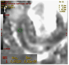 Quantitative analysis: In all patients the DWI sequences have provided images of sufficient quality for the measurement of the ADC. In particular, the mean ADC for Rutgeerts’score ≤i2 (2.82±0.83) x 10-3 mm² /s was significantly different than mean ADC value for Rutgeerts’score >i2 (1.55±0, 18) x 10-3 mm² /s matching data with Wilcoxon-Mann Whitney U test (P <0.01) (Table 11).