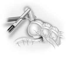 Figure 4 Pull and removal of the appendix through the left iliac fossa trocar immediately after its section, avoiding the use of an extraction bag.