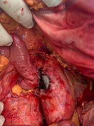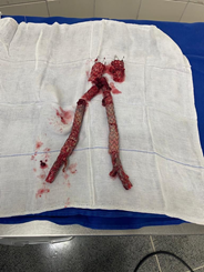 In June 2021, the patient was transferred to the Cardiology Institute of Santa Catarina (ICSC) due to low back pain associated with asthenia, fever, and prostration. An angiotomography of the abdomen was performed and showed extensive permeative gaseous focus, probably due to aortic fistula with the distal portion of the duodenum. Empirical antibiotic therapy was started with Meropenem and Vancomycin. 6 days after admission the patient was surgically approached, an axillary-bifemoral bypass and laparotomy were performed. A cavity inventory revealed an abscess and a fistula between the duodenum and the aneurysmal sac (Figure 1), besides an abscess involving the sigmoid colon and the left common iliac artery. Drainage of cavitary abscesses was performed, duodenectomy of the fistulated portion with enteroenteroanastomosis and sigmoidectomy associated with terminal colostomy in the left iliac cavity. Then the external iliac arteries were isolated and ligated, with subsequent resection of the aorta at the level of the renal arteries, with removal of the bifurcated aortic endoprothesis (Figure 2), closure of the aortic stump below the renal arteries with 2-0 prolene yarn, and closure of the cavity.